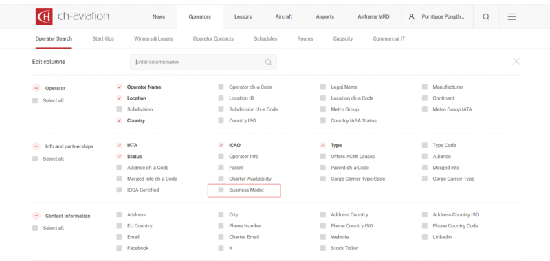 Operator Search – Business Model Filter Added
