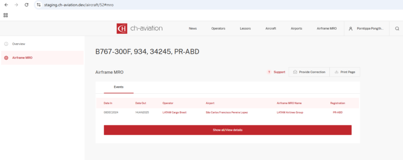 Previously, on a specific aircraft registration page, within the MRO Events tab, when fewer than 10 events were listed, clicking “Show All” or “View Details” would incorrectly redirect you to the global list of all MRO events. This issue has now been fixed. Clicking the same button now performs a targeted search for the specific aircraft registration from which the tab was accessed.